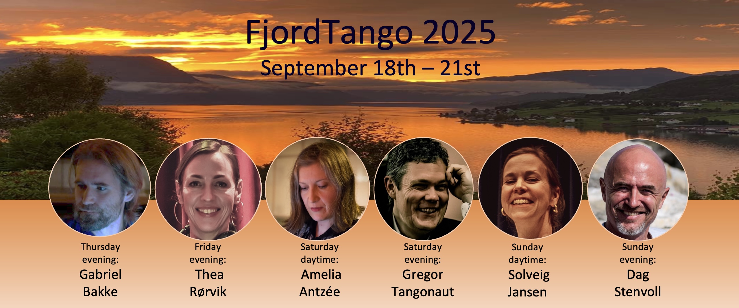 | Saturday, September 20th 10:00-13:00: Matamål food festival in the city center. Buy your breakfast here. 12:00-12:30: Flashmob – in the city center 13:00-16:00: Milonga in Vonheim. DJ Amelia Antzée 15:00-18:00: Organized by us: Sauna (& swimming in the fjord). Not organized: Several options for outdoor activities. Up to you. Things to do or see while attending FjordTango 19:00-20:00: Dinner in Vonheim (included) 20:00-02:00: Milonga in Vonheim! DJ Gregor Tangonaut |